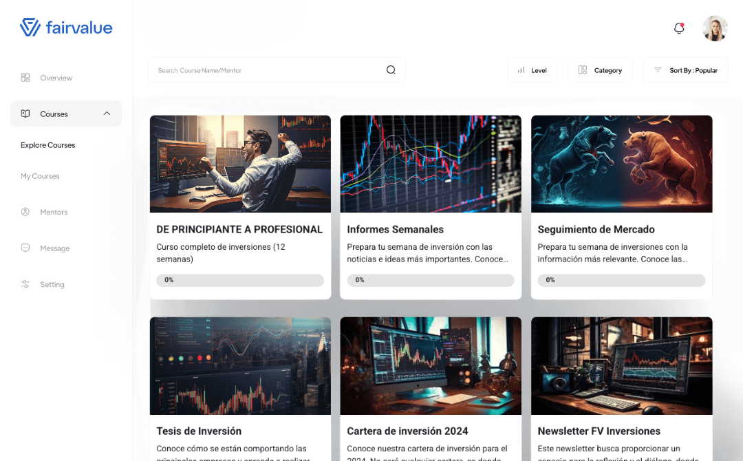 En FairValue, te guiaremos y ayudaremos a lograrlo. Por medio de un curso estructurado de 16 semanas, podrás entender desde los conceptos básicos de la macroeconomía, las técnicas del análisis técnico, hasta herramientas avanzadas de análisis de empresas.
